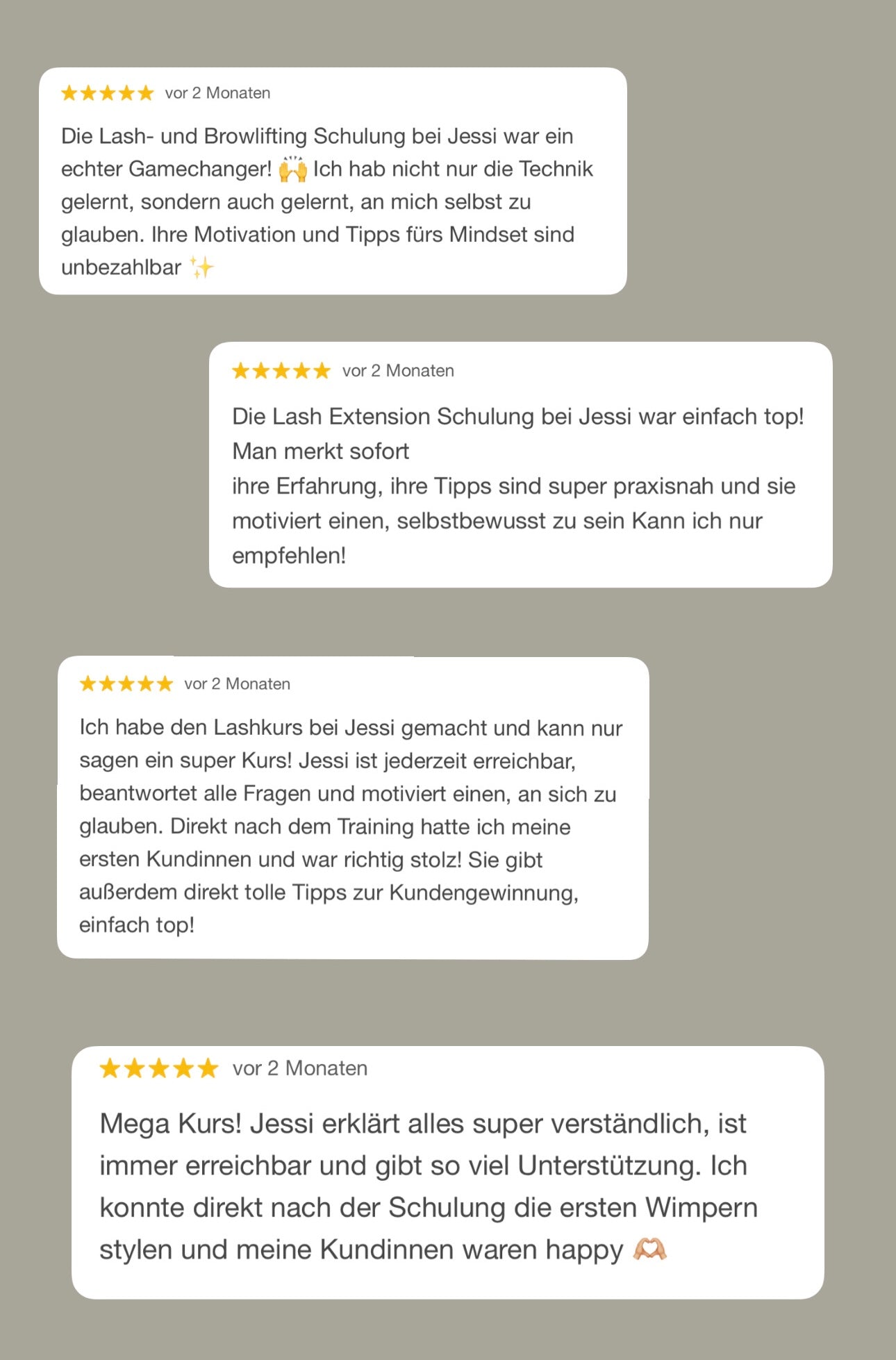„Der Kurs bei Jessi war einfach unglaublich! Sie erklärt alles verständlich, achtet auf jedes Detail und unterstützt einen, bis die Technik wirklich sitzt. Ich fühle mich jetzt bestens vorbereitet, um selbstständig zu starten.“
